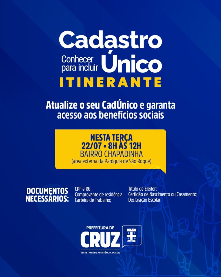 O projeto Cadastro Único Itinerante visitará o bairro da Chapadinha nesta terça-feira