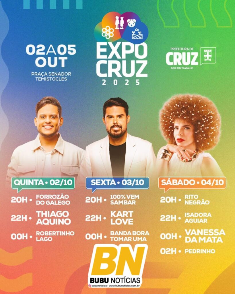 A Prefeitura de Cruz, por meio da Secretaria de Cultura e Turismo, preparou uma grade de atrações especial, pensada para agradar a toda a família. A programação cultural da festa acontecerá nos três primeiros dias do evento, a partir do dia 2 de outubro, e contará com uma diversidade de ritmos.