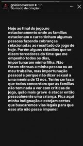 “Alguns cidadãos que se dizem torcedores do time que me empenho todos os dias importunaram minha filha. Não foram ofensas à minha pessoa ou ao meu trabalho, mas importunação pessoal e, por que não dizer, sexual a uma menina de 13 anos?”, escreveu o camisa 22 em publicação no Instagram. Veja na íntegra: