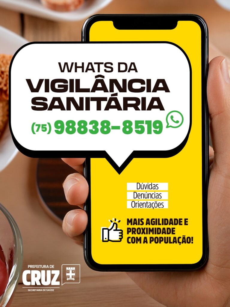 A Prefeitura de Cruz, por meio da Secretaria de Saúde, informa que a Vigilância Sanitária de Cruz das Almas passou a disponibilizar um novo canal de atendimento direto à população por meio do WhatsApp, ampliando o acesso aos serviços e fortalecendo a comunicação com os cidadãos.